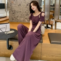 高腰闊腿褲+精緻露肩上衣,精選天然亞麻纖維,吸濕透氣親膚,幹淨整潔不輸氣質,台灣夏天首選